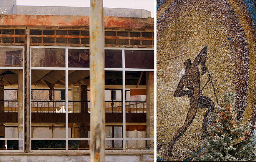 Сейчас многое разрушено. Остались голые стены и разбитые стекла. Все вырвано или спилено на металл, но все же сохранилась уникальная мозайка на стене.