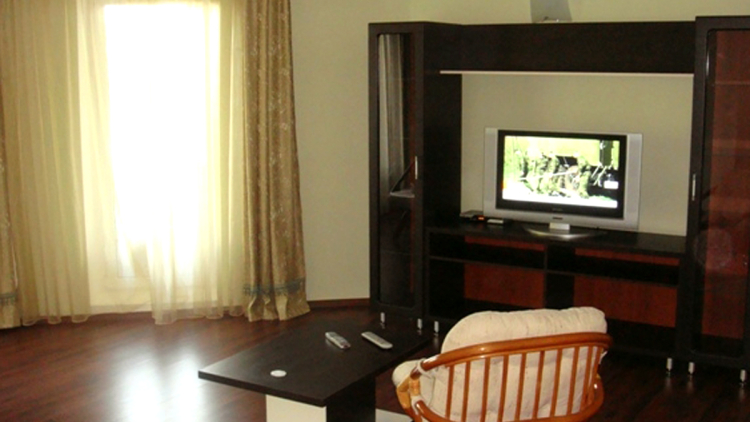 Номер категории люкс: балкон, одна комната с гостиной и спальной зонами, мягкая мебель, двуспальная кровать, телевизор, ванная комната с душевой кабиной, мини-бар, чайник. Номер рассчитан на 2-4 гостей.