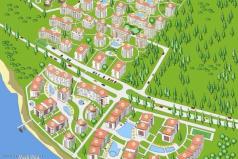 Besides the splendid swimming pools and the beautiful green areas there are four children playgrounds, outdoor fitness, beauty and massage center, medical center, supermarket, fitness, sauna, Pizza restaurant, “Ship – Bar-Restaurant” with panoramic view, free parking for owners and guests, tennis court/football field.