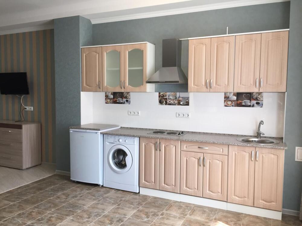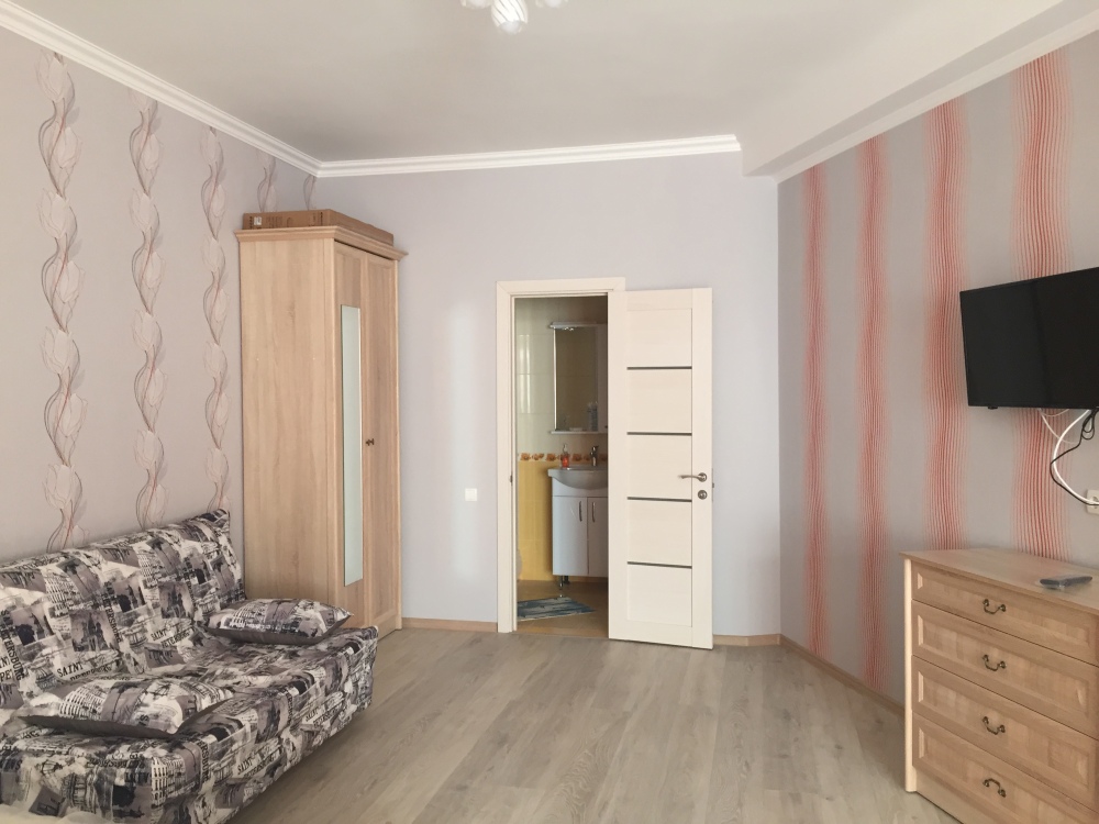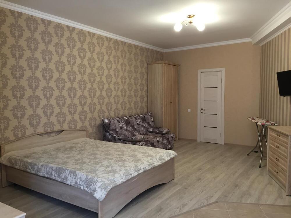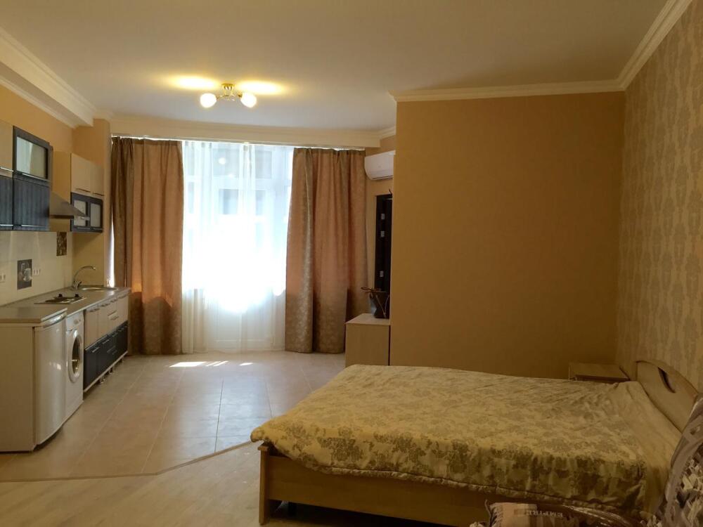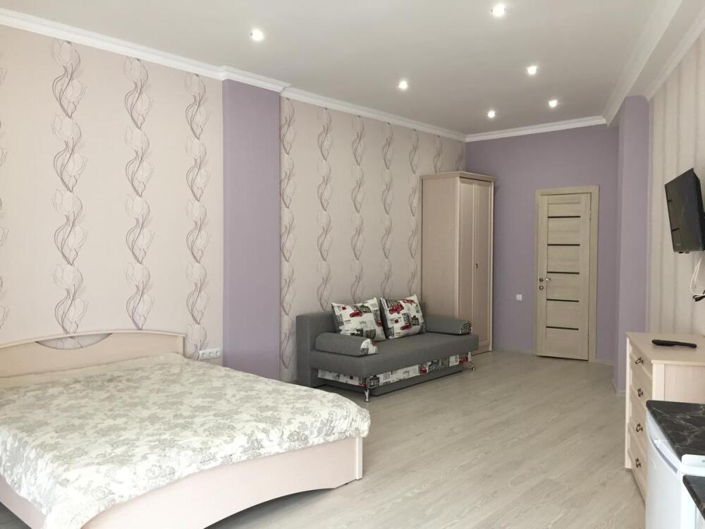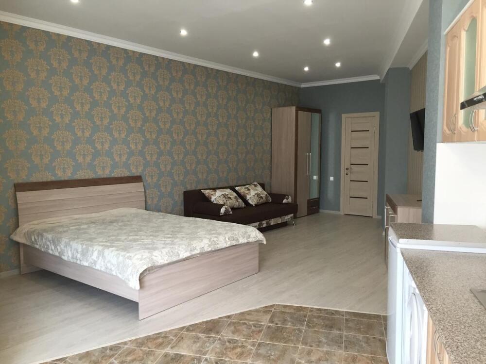Апартаменты-Студио площадью 32 кв. В апартаментах двуспальная кровать, раскладной диван, кухня со всей необходимой посудой для проживания, стиральная машинка, кондиционер, TV все федеральные каналы, собственная ванная комната.