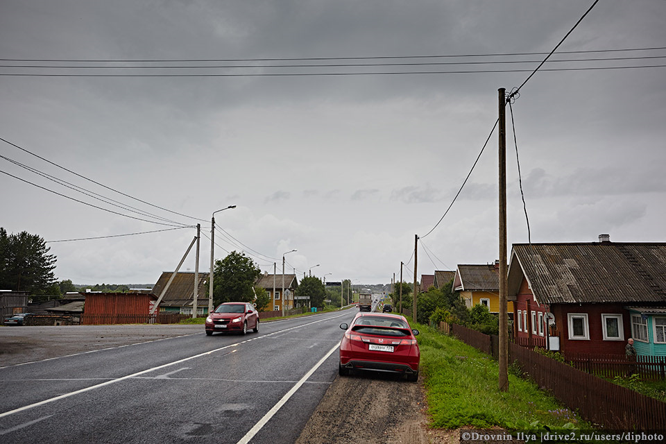 02.Как назло, дождь поливал всю дорогу, то больше, то меньше. Обгонять было очень неудобно, особенно перед Вологдой, где большое трафик и куча камер. Скоростной режим был явно не уместен в этот день, а остановки свелись только к заправкам. Так мы долетели до границы с Архангельской областью.