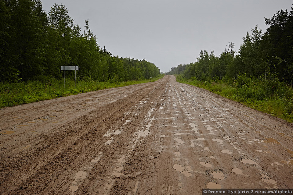 20.Местный водитель, подтвердил и вернулись на «трассу». Но это была дорога чуть лучше, грязь, лужи, гребенка. Как писали организаторы тут ехать 2 часа на раздолбанном Соболе. Покатавшись в другие путешествия по Архангельской области, в качестве таких дорог я не сомневался, но сейчас она была разбитая. А у нас была очень низкая машина, с просветом при загрузке всего 8см. Ехать быстрее 20-30км/ч не получалось. Оставалось еще 130км… И мы попали, причем хорошо…