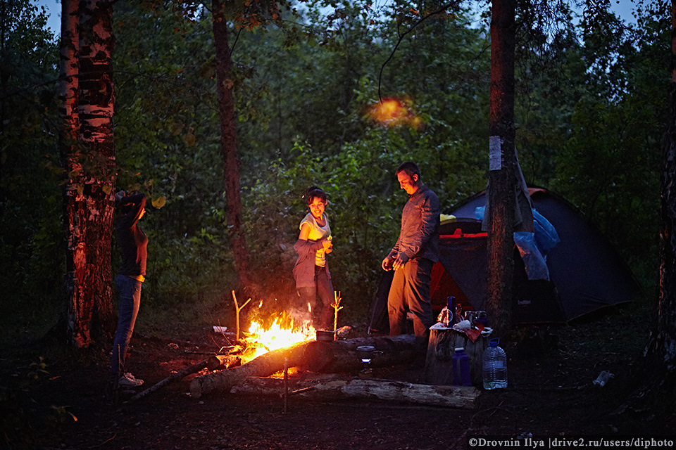 12.Дождь за весь день ни разу не прекратился, и шел в нескольких состояниях: от мороси до ливня. Тут стало ясно, что за день мы точно не доедем до фестиваля. До Архангельска оставалось 150-200км и потом еще 200км грунтовых дорог. На ночевку стопнули в знакомом месте на озера у Сийского монастыря. На сивке туда было не заехать, и машину оставил на обочине. Тут вышел небольшой нюанс с палаткой, она была новая. Дуги в палатке были длиннее, причем сильно, и как ни пытались их натянуть, не получалось. Что-то не так. Русские люди инструкции не читают, так что закосили под иностранцев и залезли, почитали бумажки. Эврика! дуги в тент, а палатку за тент цеплять. В обще промочили палатку, пока ставили. Внутреннюю часть быстро высушили с помощью газовой горелки. В этот день упал спать как кот без задних лап.