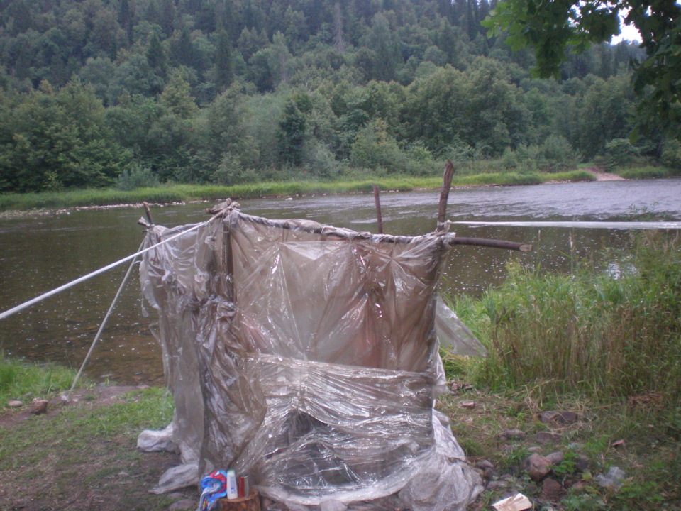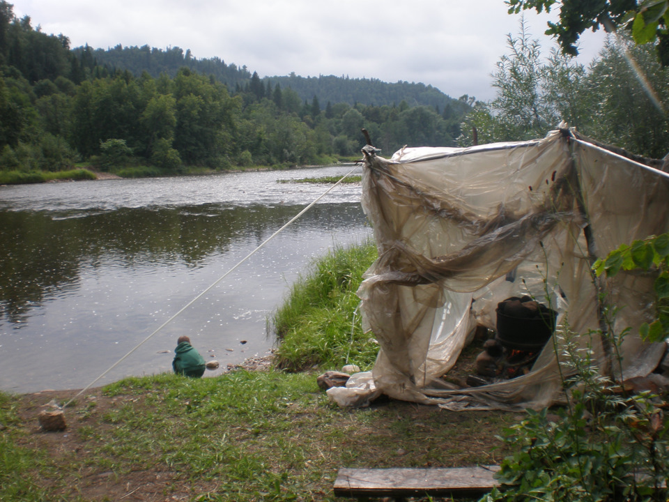 Пригнали в Инзер, до вечерней электрички было еще 4 часа. Поэтмоу расположились на нашей секретной поляне. Там нет народу, шума, и главное — москитов).Вокруг сосновый лес, мой любимый. Правда я еще сгонял в хоз.маг и купил пленку для нашей тонкой летней палатки, по прогнозу ночью был дождь. И прогноз был точен.