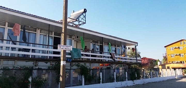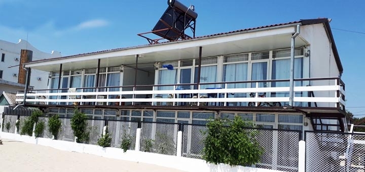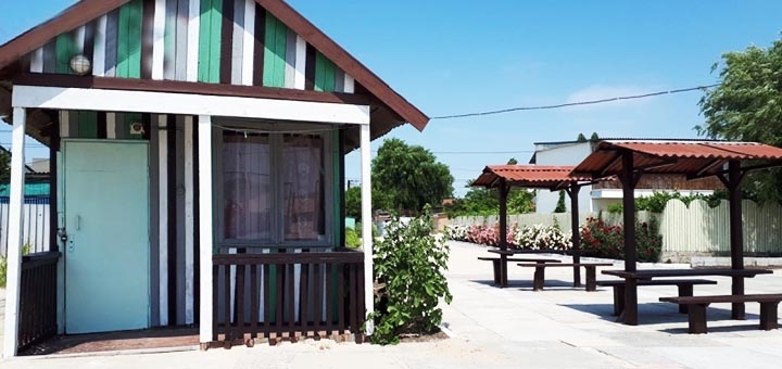 На базе есть несколько деревянных домиков по цене 50 грн. в сутки с человека в первой линии от моря.
