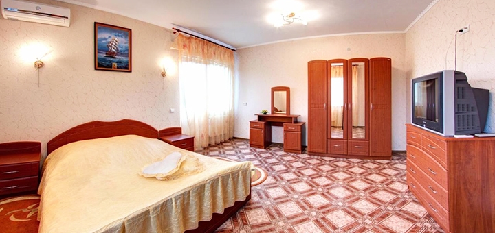 Отдыхали всей семьёй и получили удовольствие от моря и погоды. Разместили нашу семью в двух этажном домике. Домик обставлен 5ю скрипучими(очень)кроватями, тумбочки возле кроватей, холодильник, шкаф, даже имеется посуда. Номер оказался достаточно пыльный, такое ощущение, что в нём убирают только жильцы которые выезжают с домиков, а не работники базы. Постель очень старая, в ржавых пятнах. Имеется горячий душ, только в женской душевой