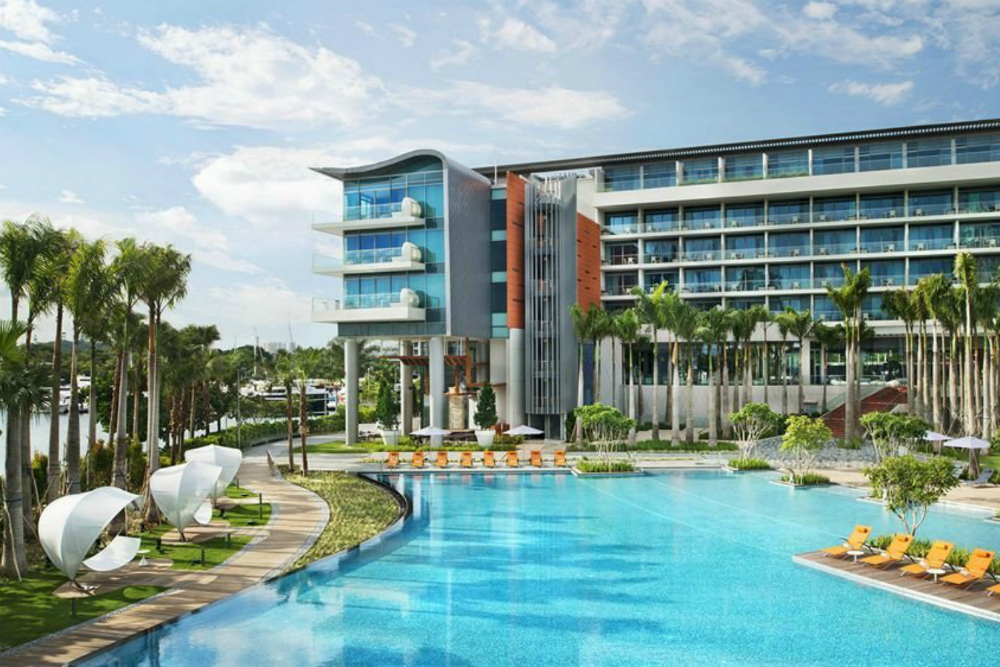 Здесь тоже выдают личный смартфон. Можно звонить сколько угодно по внутренним номерам — например, держать связь с друзьями, которые приехали с вами. На смартфоне есть гид по Сингапуру и отмечены самые посещаемые места. При отеле есть просторный бассейн, окружённый пальмами. Прямо под водой установлены динамики, чтобы вы плавали под музыку. А теперь видео-экскурсия по отелю.