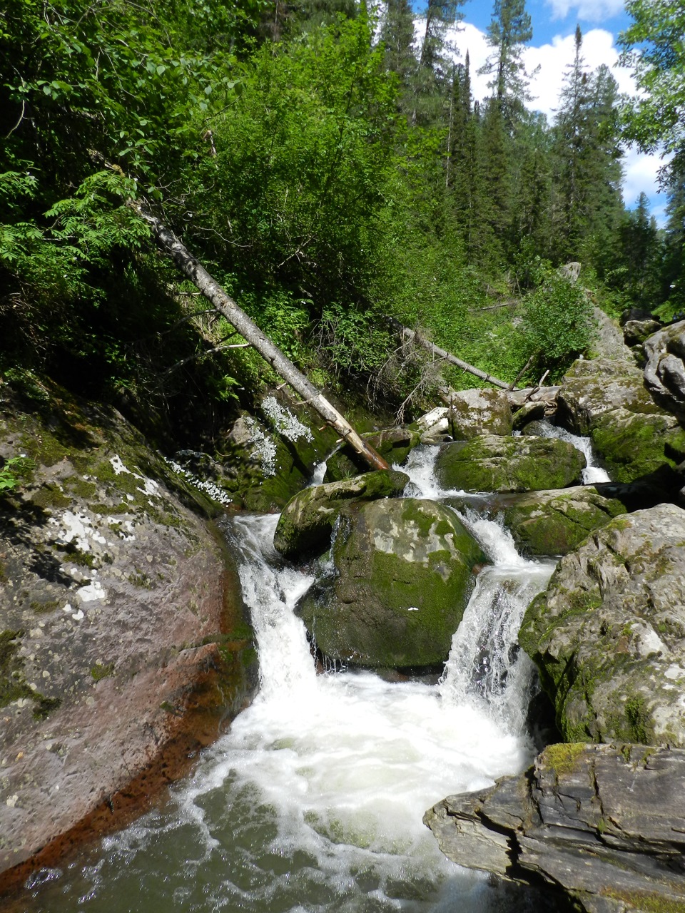 Подняться вверх по ней можно по узкой тропинке, местами — по камням и переброшенным с одного на другой берег деревьям.