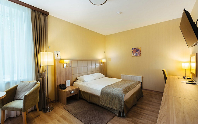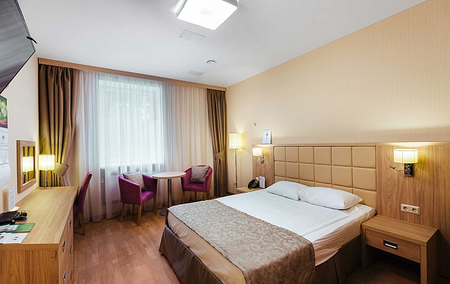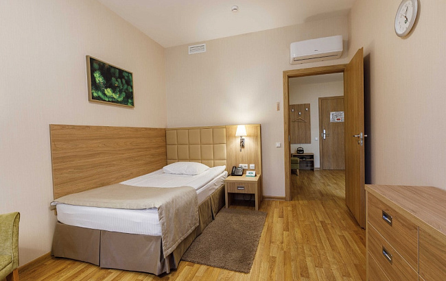 В номере: кровать полутороспальная, зеркало, прикроватная тумбочка, стол, стулья, шкаф, кондиционер, мини-холодильник, сейф, телевизор ЖК, телефон, электрочайник, процедурная комната.
