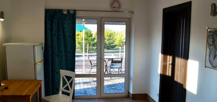 Жилой корпус на 8 номеров : четыре четырехместных и четыре двухместных.В каждом номере санузел — душ, умывальник, унитаз. В четырёхместном номере к Вашим услугам находятся четыре отдельных кровати, телевизор, спутниковое телевидение, кондиционер. Два двухместных номера — двухспальные кровати, и еще в двух — по две односпальной кровати плюс стол, холодильник. Все матрасы ортопедические. Есть возможность доставить кровать-раскладушку для ребенкаКоттедж №5 : в большой комнате с нишей расположена двухспальная кровать и диван, телевизор, спутниковое телевидение , кондиционер, холодильник, чайник, отдельный санузел, и веранда с видом на Днепр.