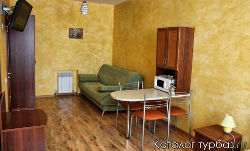 Номер «Уют» состоит из спальни и санузла, общей площадью 15 кв. м. В номере есть сейф для хранения документов и ценностей, шкаф с вешалками для личных вещей, тумбочка для обуви, раскладывающийся диван, кровать и прикроватные тумбочки, зеркало. Температура в номере может быть отрегулирована в соответствии с вашими запросами — в зимнее время с помощью термостата на батарее, в летнее — установкой нужных значений на кондиционере. Проветрить номер можно открыв окно, оснащенное москитной сеткой.