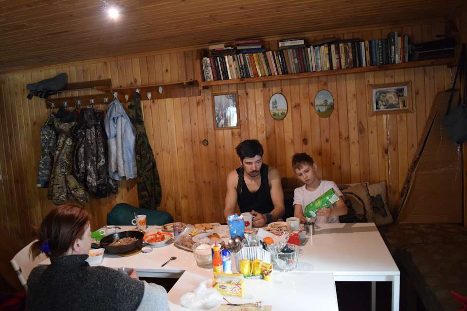 проживание в рубленной избе: печное отопление, электричество от дизель-генератора; 10 мест