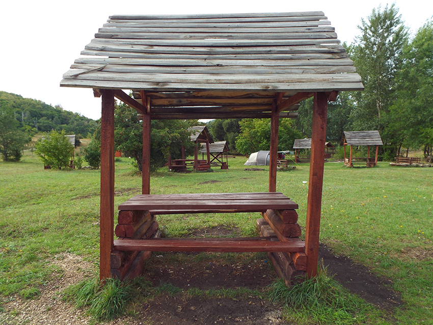 Огороженная площадка для установки палаток и пикников с навесом, столом; туалеты, вода.