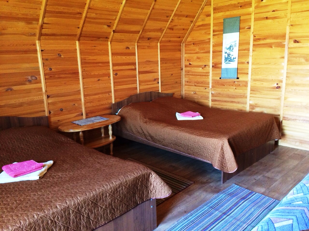Для размещения гостей предлагаются двухместные деревянные домики с отдельным входом, обустроенные душевыми кабинами, санузлами, телевизорами, тумбочками, шкафами и мягкими кроватями с ортопедическими матрацами. На территории также располагаются просторное кафе на 100 человек и охраняемая автомобильная парковка.