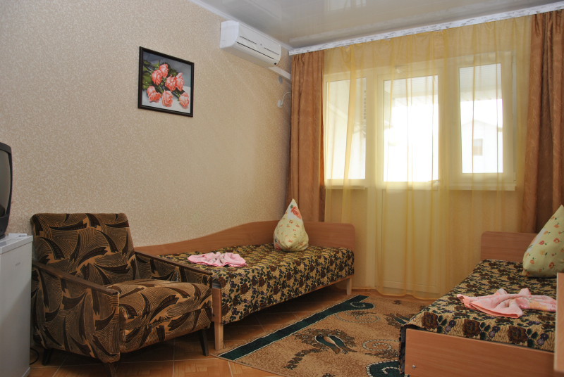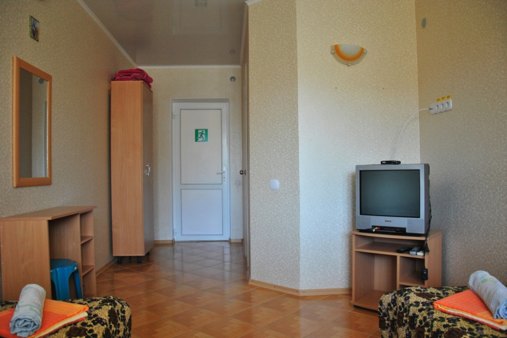 Коттедж "ОЛЬГА" представляет собой основательное каменное здание, возведенное в 2005 году и спрятанное от палящего солнца в тени деревьев. Просторные и светлые номера с лоджиями рассчитаны на три взрослых персоны. Здание прохладное. Постояльцы практически кондиционерами не пользуются. Номера, площадью 21 кв.м, в том числе площадь санузла 3 кв.м, а лоджии - 6,3 кв.м, укомплектованы холодильником, телевизором, электрочайником, гладильной доской, столом, стульями, табуреткой, фумигатором, махровыми полотенцами, туалетной бумагой, зеркалом, вешалкой, пластиковым тазом.