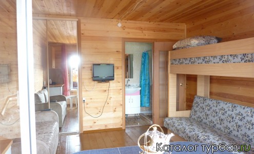 Четырехместный дом (9 кв.м.) - однокомнатный. В доме две односпальные двухъярусные кровати, телевизор, холодильник, откидной стол, 2 стула, . Постельное белье, одеяло, подушки предоставляются. Услуги горячего душа платно 20 мин.-50 руб./ чел, туалетные комнаты общего пользования.