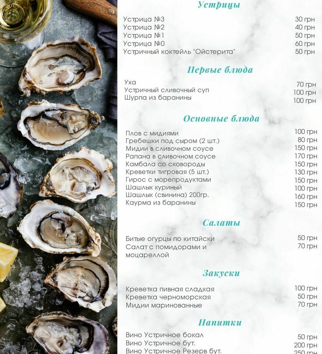 Есть два пакета: В большой пакет стоимостью 460 грн./чел. входит - 6 устриц, 2 бокала вина и экскурсия😉 В маленький сет стоимостью 300 грн./чел. входит - 3 устрицы, 1 бокал вина и экскурсия😉