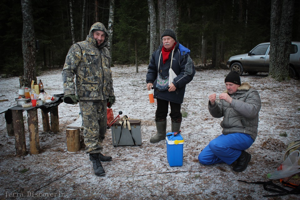 Наши рыбаки собирают свой шмурдяк, и с нетерпением и трясущимися от жажды "Рыбы-мечты" руками дислоцируются на лёд: