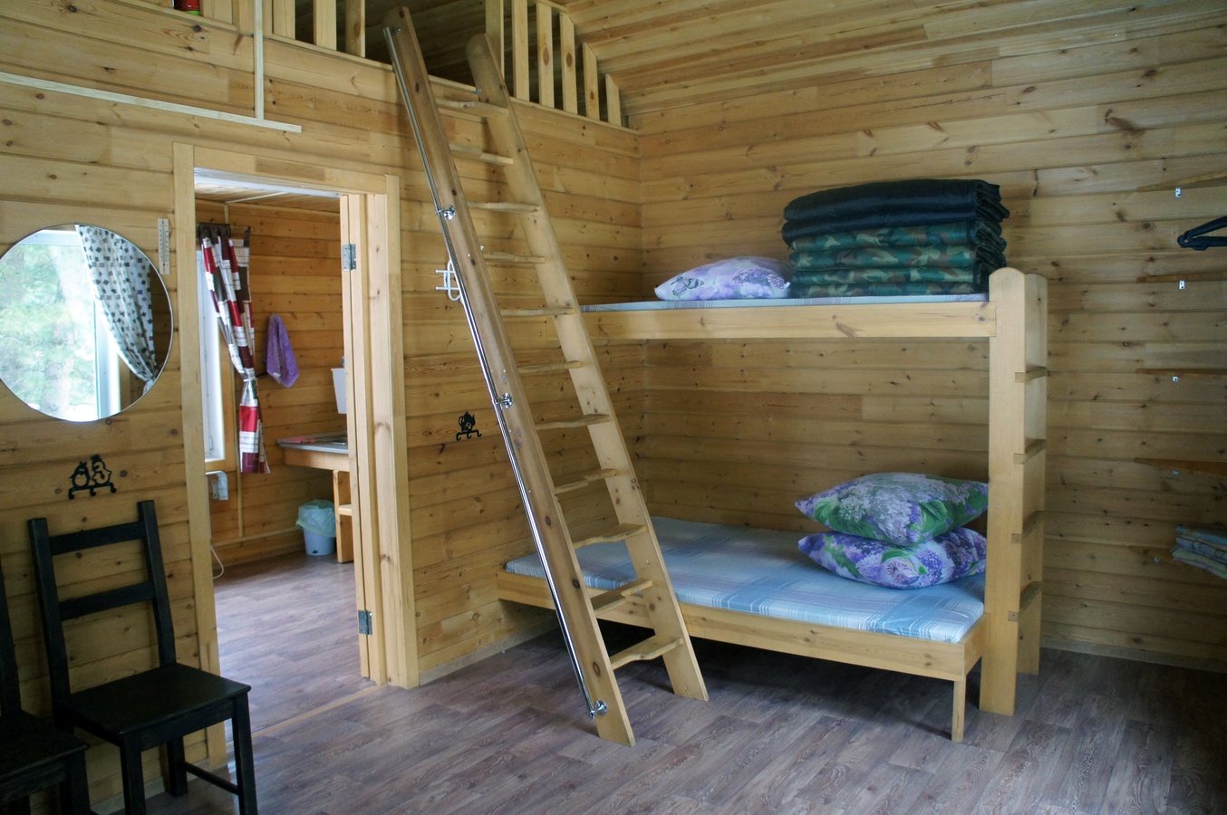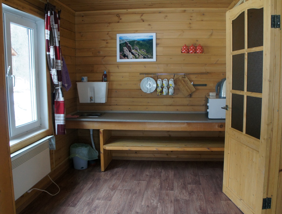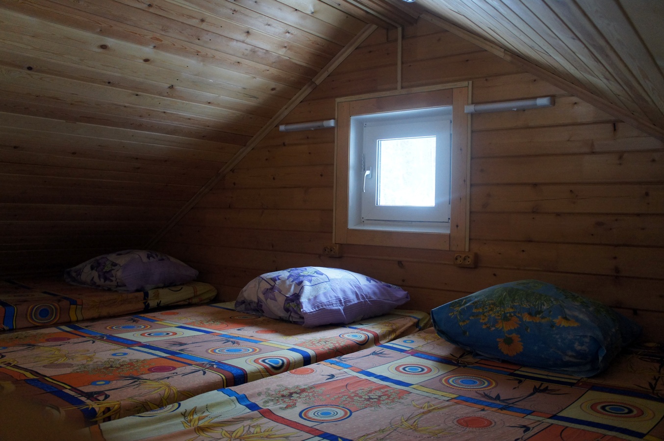 Сейчас на территории восемь тёплых деревянных домиков. Внутри каждого - две комнаты, разделённые дверью: прихожая с кухней и собственно комната. В кухне - «дачный» умывальник, в который нужно приносить воду, электросушилка для одежды, посуда, микроволновка и чайник. В комнате два окна, обогреватель, стол со стульями, двухъярусная кровать, а над кухней - антресоль с двумя матрасами и маленькой форточкой. Всего в нашем домике было 6 спальных мест. Но нас набралось шестеро взрослых и трое маленьких детей, было достаточно комфортно =) Дети пару часов точно гурьбой скакали на матрасах! =)