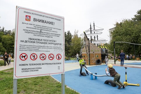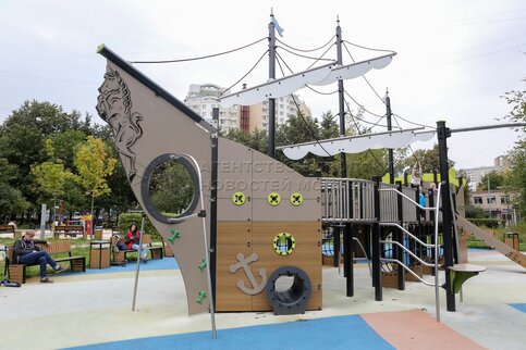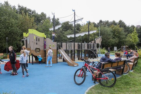 Для детей оборудовали семь игровых площадок. На одной из них установлен большой игровой комплекс «Корабль».