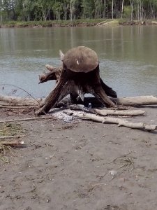 Зайдя в нее и найдя подходящий песчаный берег, выгружаемся, и, дедушка отправляется ловить с берега, Александр накачивает Уфимку, а я тоже отправляюсь на лов. Идя по дедовым следам, слышу громкий плеск, а затем из-за угла появляется, торжественный и довольный, дедушка, неся в одной руке спиннинг, а в другой руке щучку весом примерно 700-800 граммов (Взвешивали только двух самых крупных, поэтому вес дан приблизительно). Далее мы с ним хотели пройцтись по другой стороне берега, но я утонул в топком берегу почти по колено. Отсыпав дяде Саше в отдельную коробку приманок и вручив воду, спиннинг, и подсачек с садком, отправляемся (все 3-е) в свободное плаванье. Дрейфуя по течению узенькой, натыкаемся на перспективное место, выходим на берег, и кидаем приманку среди кустов. Оставив там одну красно-белую съедобку, и поговорив с другим экипажем, а также выудив еще щуку (700-800 г., и снова у деда) принимаем решение ехать к машине. Дотянув Уфимку на буксире до тех-же песков, где надували, сдуваем ее и кладем в мешок. Примерно в 20.30 прибываем на берег, где припаркована машина, ставим палатки, сушим у костра мокрые одежду и обувь, ужинаем, отмахиваясь от летучих тиранов, и ложимся спать. (В этот раз обошлись спас-жилетами и одеялом, вместо матраса). Пока спали, мыши залезли в пакет с рыбой и погрызли ее, к счастью не сильно.