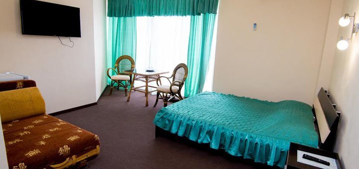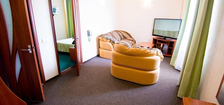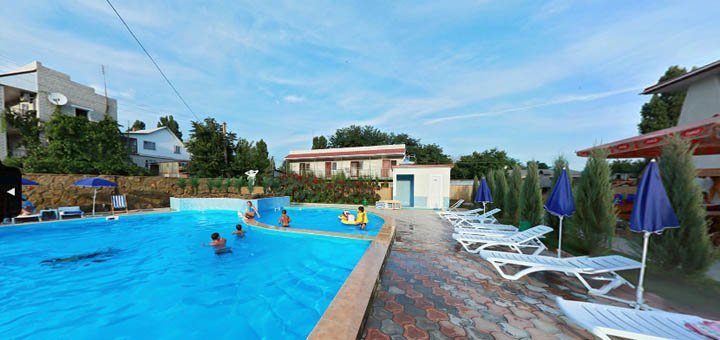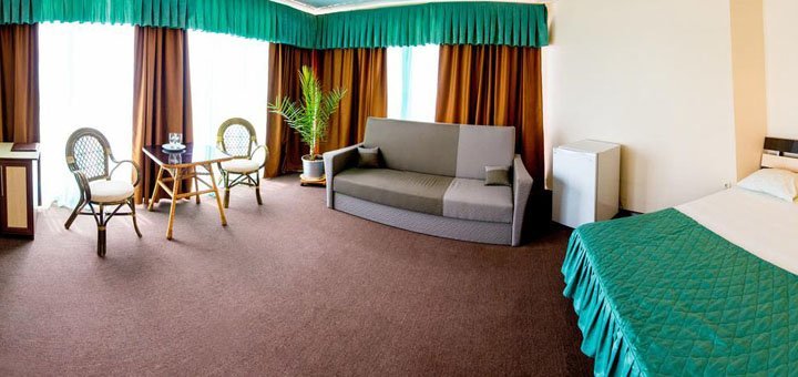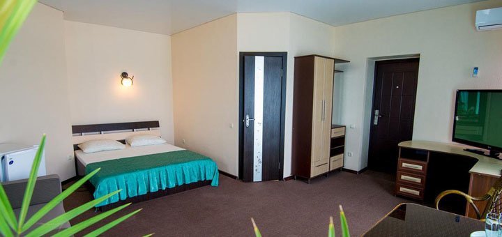 В стоимость входит двухразовое питание в столовой базы. В стоимость входит пользование бассейном.Номера Люкс: Номер под ключ на 2, 3, 4 человека. Все удобства: (своя скважина) горячая и холодная вода круглосуточно - умывальник, унитаз, душевая. Номер оборудован спальней: двуспальная кровать с постелью, шкаф, трюмо, комод, тумбочки, столик, мягкий раскладной диван. В номере находится кондиционер, телевизор, холодильник. Евроремонт. Металлопластиковые окна и двери.