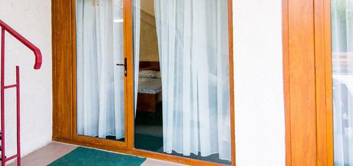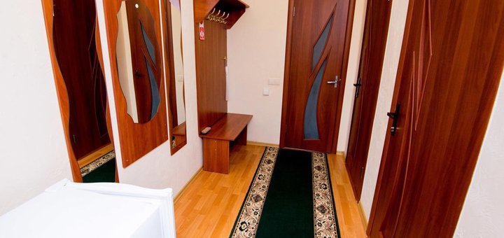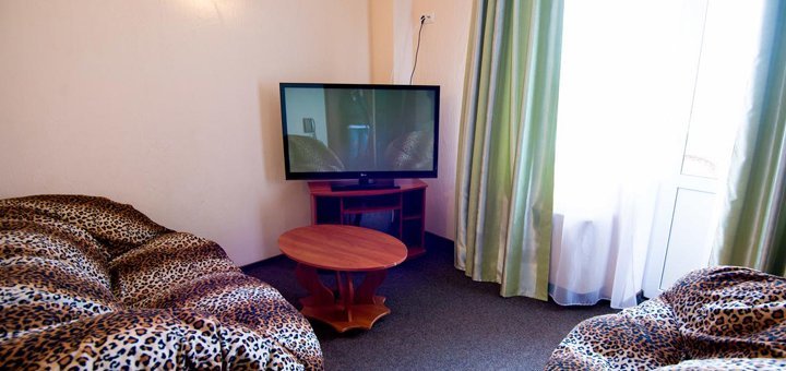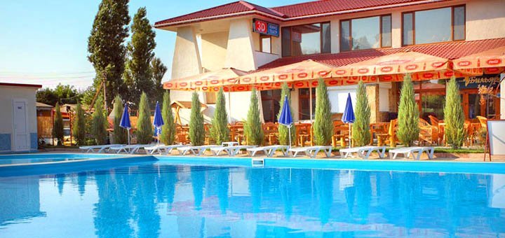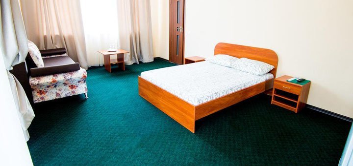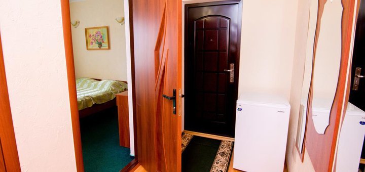 В стоимость входит двухразовое питание в нашей столовой. Но в стоимость не входит пользование бассейном. Желающим пользоваться бассейном - 40 грн. в день.Номера Полу-Люкс: Отдельный номер под ключ на 2, 3, 4 человека. Все удобства: горячая и холодная вода круглосуточно умывальник, унитаз, душевая - (своя скважина). Номер оборудован спальней (двуспальная кровать с постелью, шкаф, трюмо, комод, тумбочки, стол, мягкий раскладной диван). В номере есть телевизор, холодильник в коридоре. Евроремонт. Металлопластиковые окна и двери.
