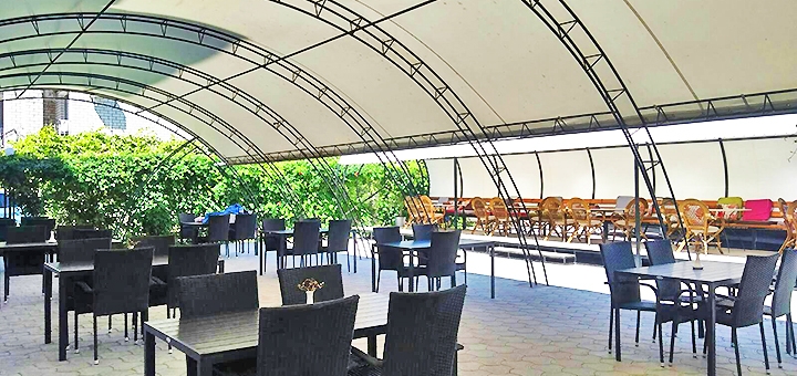 На территории комплекса расположена столовая, в которой организовано 3-х разовое питание отдыхающих по цене: 125 гривен (оплачивается дополнительно). Также есть специально оборудованная кухня для самостоятельного приготовления пищи, укомплектованная всем необходимым. Мангал для приготовления шашлыков, шампура, угли.