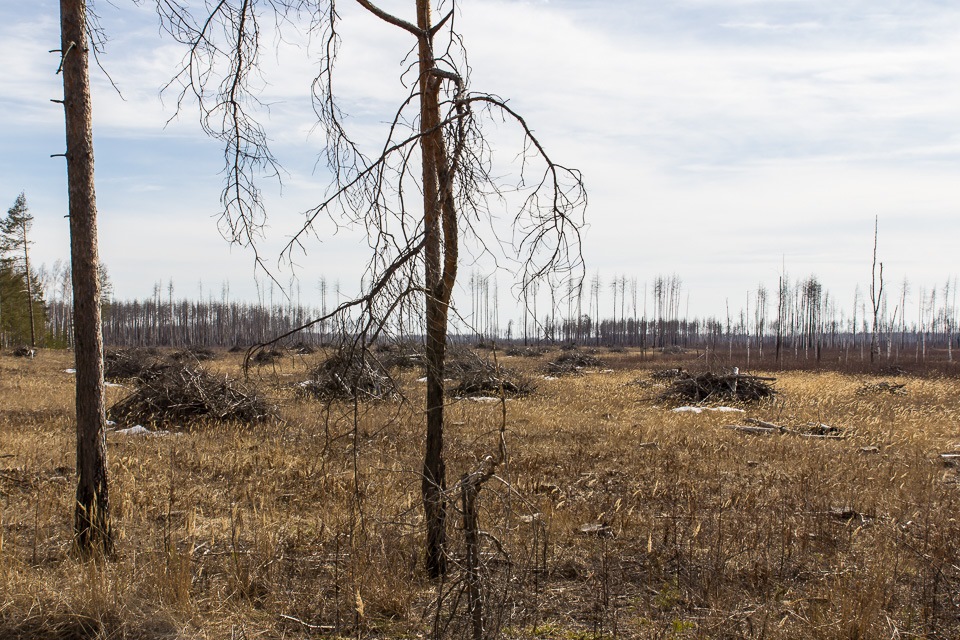 Впрочем, до свалки мы тоже добрались. И даже заглянули внутрь ямы. Судя по дотлевающим обломкам каких-то деревянных конструкций, мусор сюда перестал свозиться задолго до покупки земли и уж тем более установки шлагбаума. Никаких свежих следов деятельности человека увидеть не удалось, да и колея, по которой раньше, вероятно, двигались машины, практически заросла травой. Так что аргумент, выдвинутый хозяином участка об ограничении проезда, выглядит слабовато.