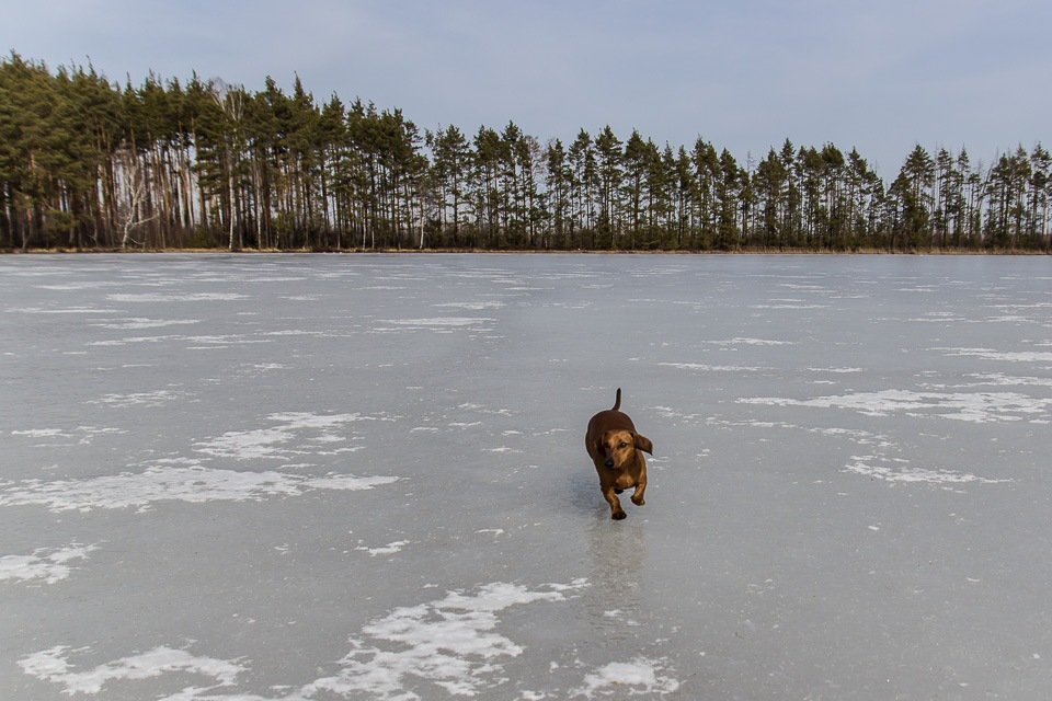 Собака с неописуемым восторгом бегает по льду. А где-то справа рыбаки, что-то ловят.