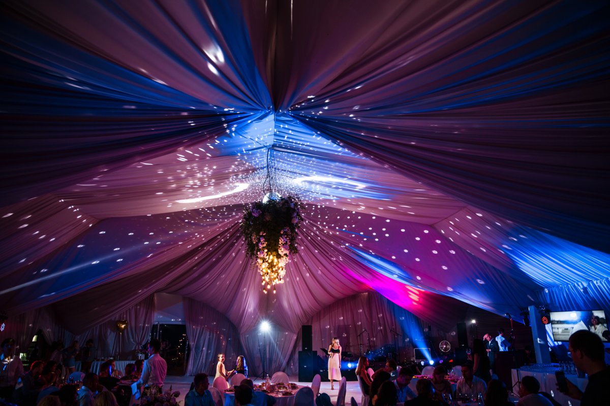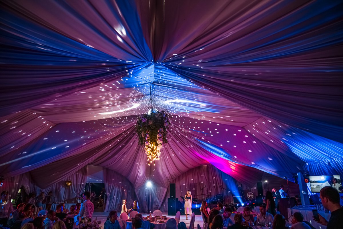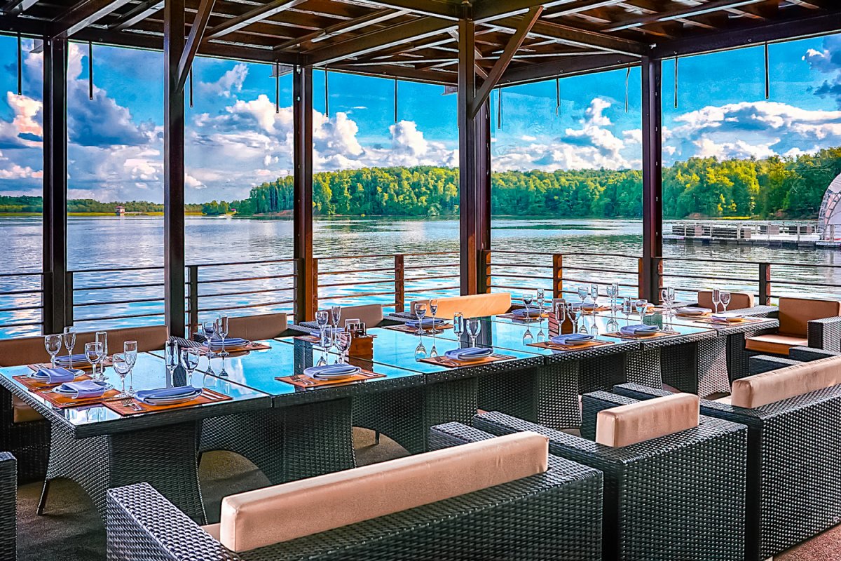 Вместимость шатра — до 250 персон при комфортной рассадке! 500 кв.м торжества в шатре на причале с потрясающим видом на водный фотопейзаж! Гости могут арендовать банкетный ресторан или шатёр у воды, в котором есть отдельная гримёрная зона для артистов и собственное помещение под кейтеринг. Основной зал ресторана, рассчитанный на 80 персон оборудован современным комплектом звуковой и световой аппаратуры, с возможностью трансляции видео на телеэкраны, а праздничное меню удивит всех разнообразием блюд!