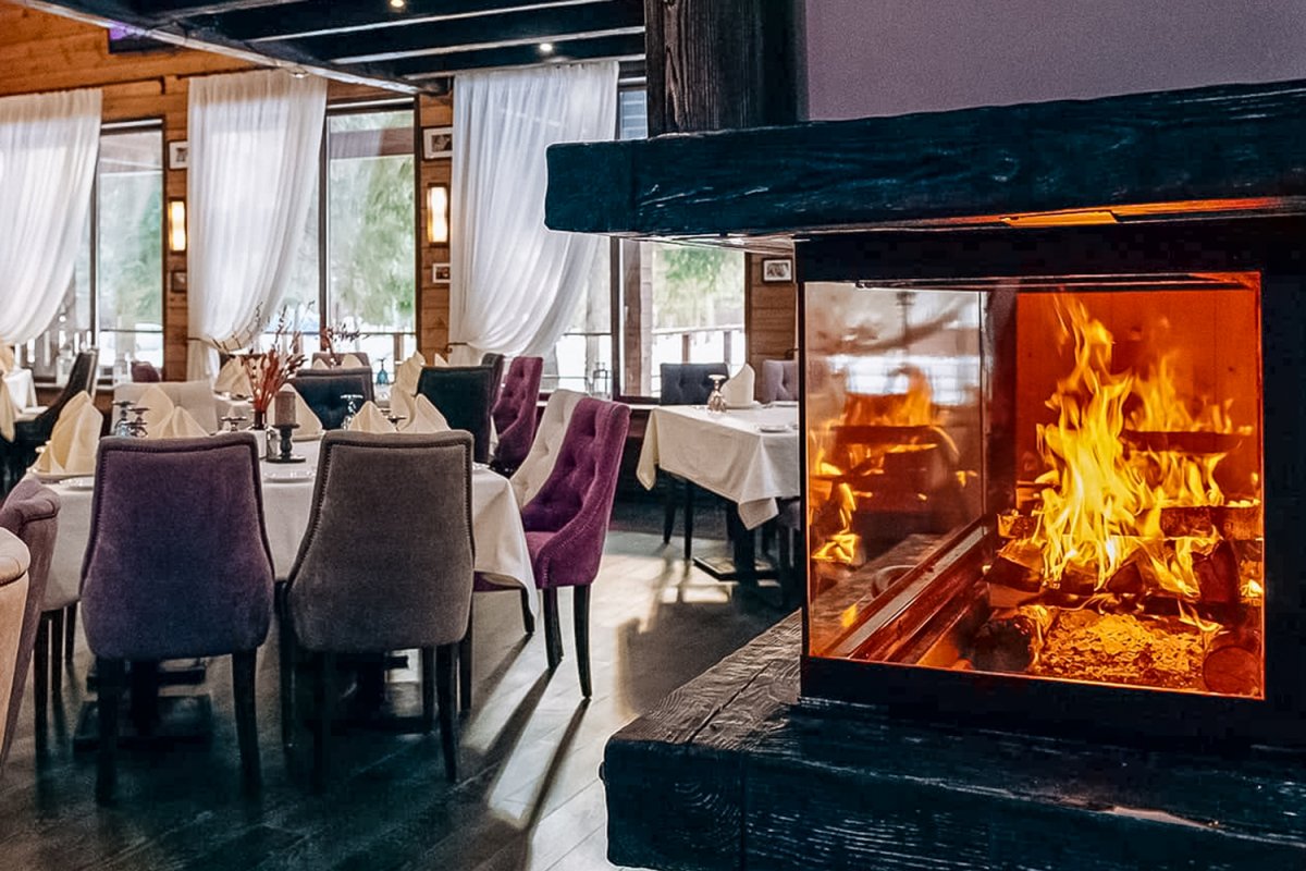 Деревянный ресторан «Шале» с камином в уютном зале заслуженно пользуется популярностью для небольших свадеб.