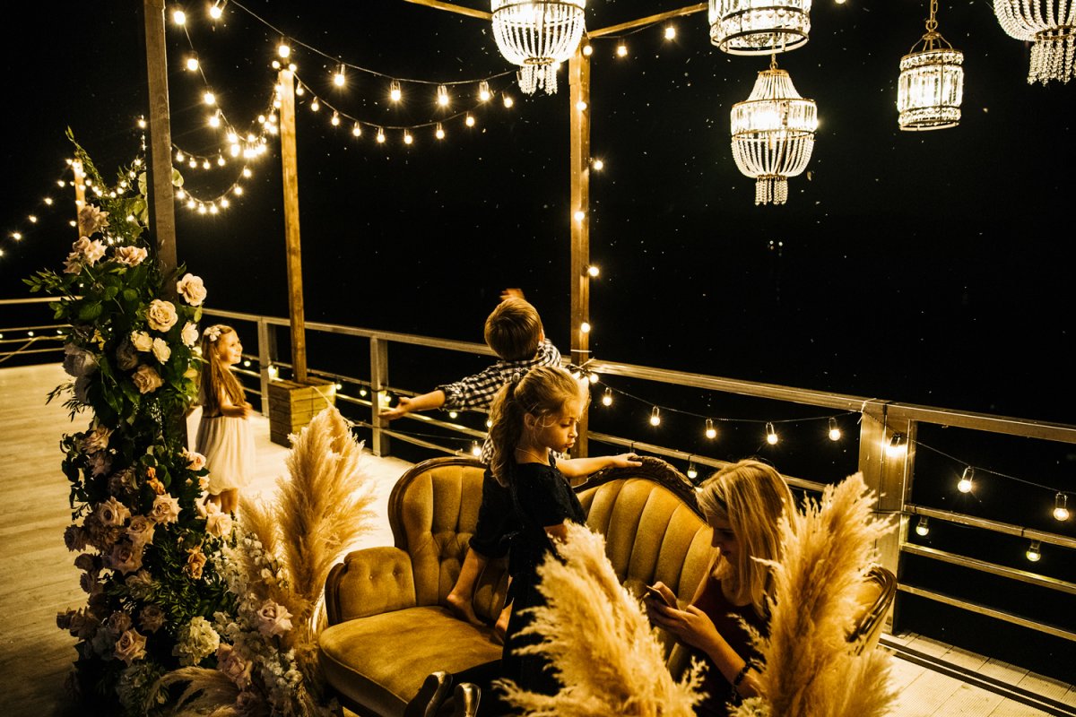 На первом уровне плавающего бара находится зона для торжеств с уютной ротанговой мебелью и потрясающим видом на водохранилище через панорамное остекление. На втором этаже — lounge с обзорной площадкой, где можно оформить зону церемонии или велком. Окна бара оборудованы прозрачными пвх-экранами для защиты от возможного дождя и ветра, а в солнечную погоду их можно легко открыть и насладиться прикосновением свежего бриза.