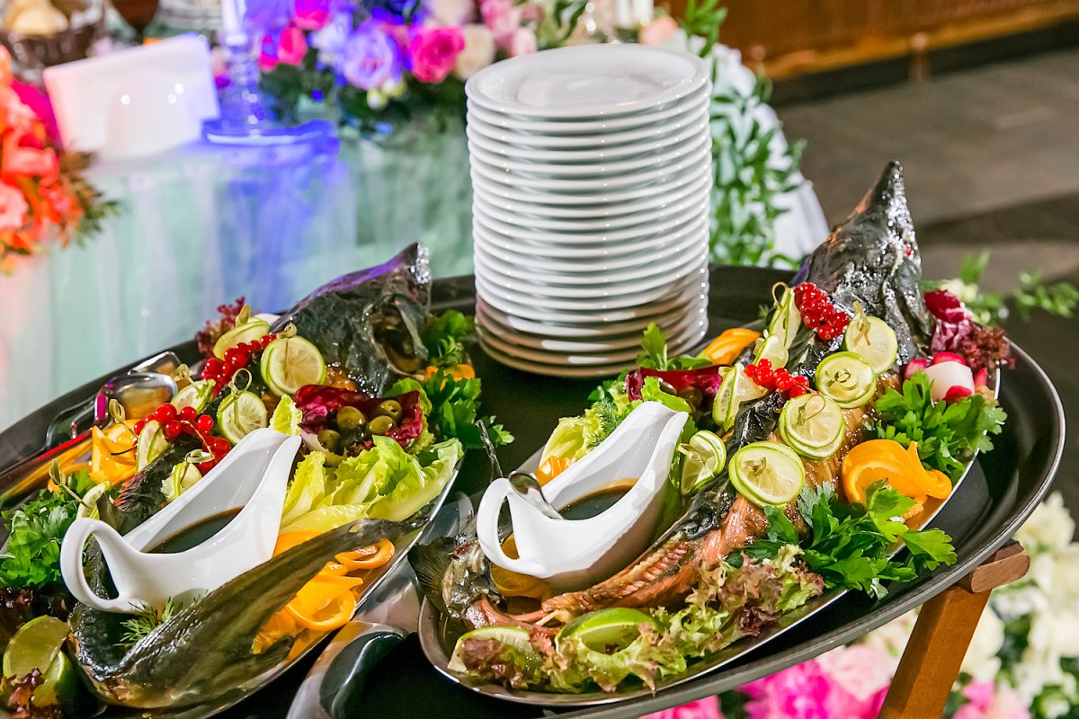 Для камерных вечеринок — подача Family Style, когда гостям выносятся горячие блюда на большой тарелке в ассортименте. Так каждый может попробовать и шашлык, и дорадо.