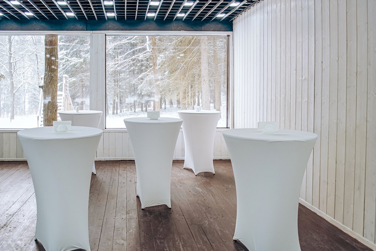 Отапливаемое помещение площадью 100 кв.м. с панорамным остеклением находится в сосновом лесу. Площадка оборудована кондиционером, звуковой системой Turbosound и LED-панелями для синхронной трансляции контента.