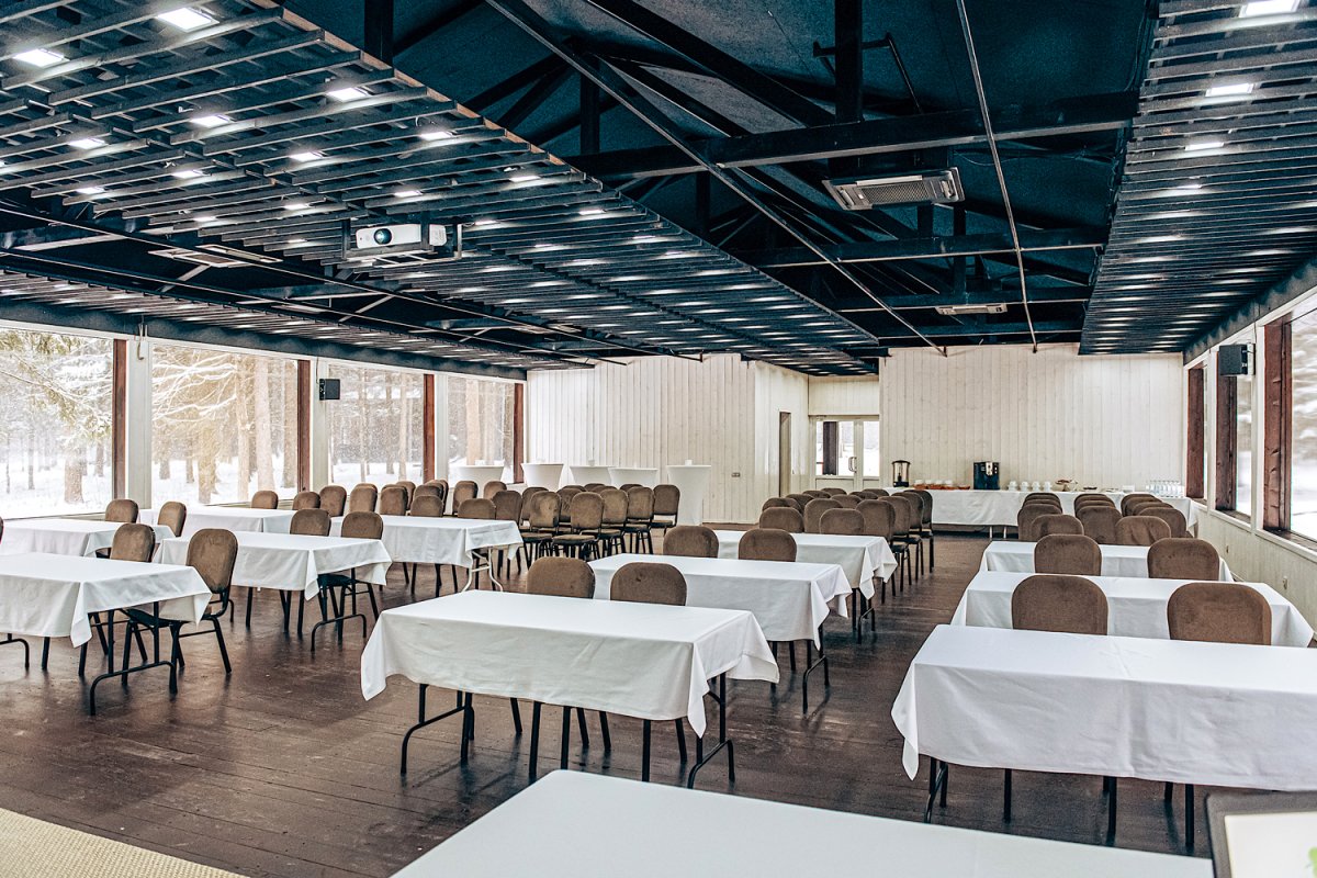 Это зал-трансформер, который подходит для разных мероприятий — от свадебных вечеринок до конференций. Его вместимость 200 человек. Главные плюсы этого зала: встроенное профессиональное оборудование, панорамные окна с видом на сосновый лес и прилегающая зеленая территория для церемоний на открытом воздухе.