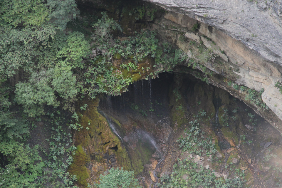 Автобус высадил нас перед туннелем в ущелье за которым начинается Черекская теснина. Перед въездом в туннель, а их там целый комплекс, стекал небольших размеров водопад.