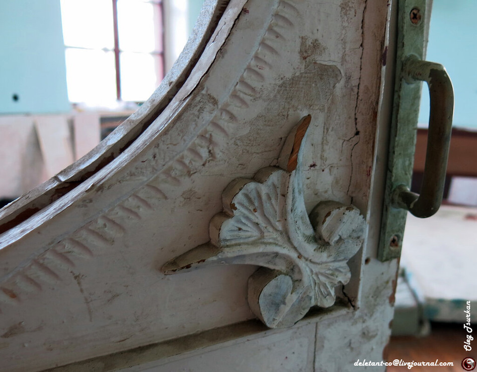 Кстати дом пустует уже несколько лет и потихоньку начинает умирать. Кое-где протекает кровля, которая хотя и сделана на первый взгляд добросовестно, но конструктивно выполнена не для нашей климатической зоны. Потеки дождевой воды начинают пожирать внутренний декор.