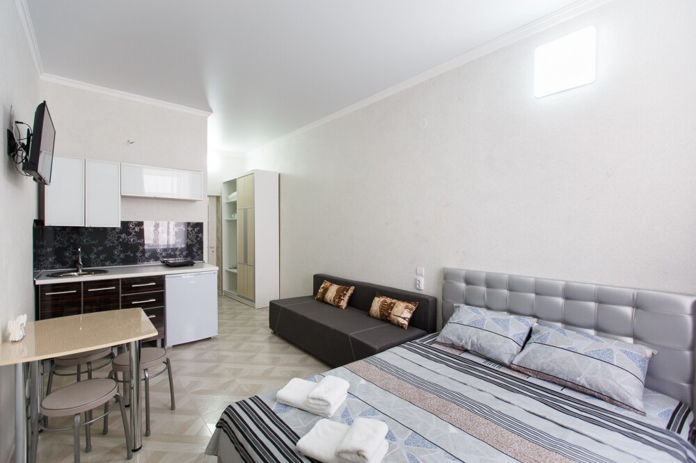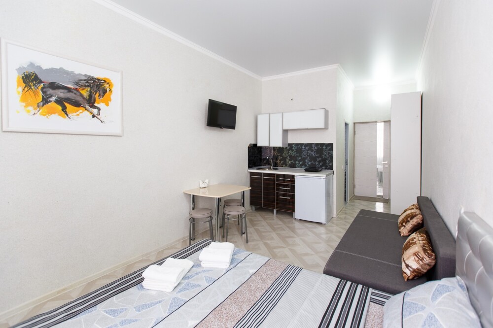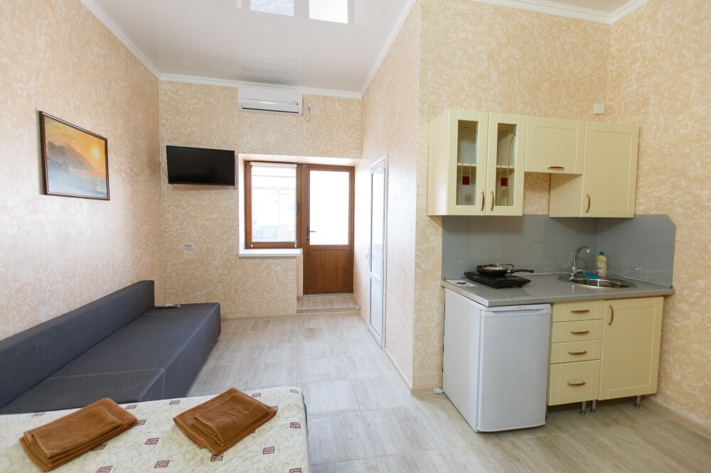 Номер комфорт: уютный и просторный однокомнатный номер с кухней, площадью 25 м². В номере двуспальная кровать и раскладной двухместный диван. Максимальное количество человек - 4. В номере есть: Кровать и раскладной диван WIFI Тв с доступом в