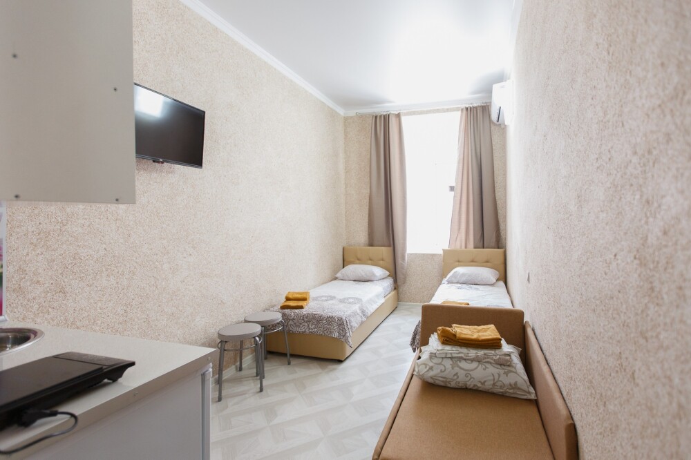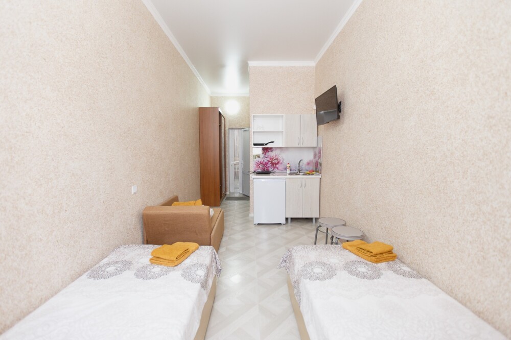 Номер стандарт: уютный и просторный однокомнатный номер с кухней, площадью 25м². В номере двуспальная кровать и раскладной двухместный диван. Максимальное количество человек - 3. В номере есть: Две односпальные кровати и раскладной диван WIFI