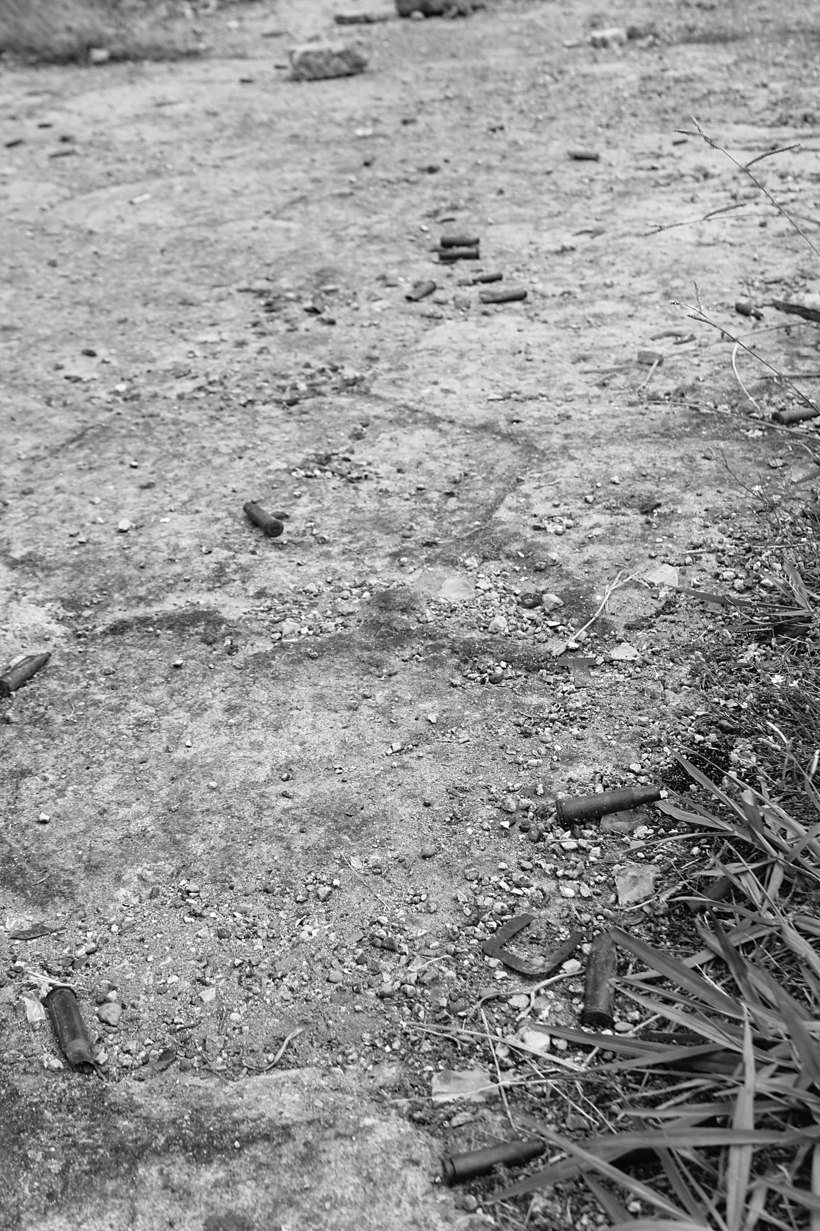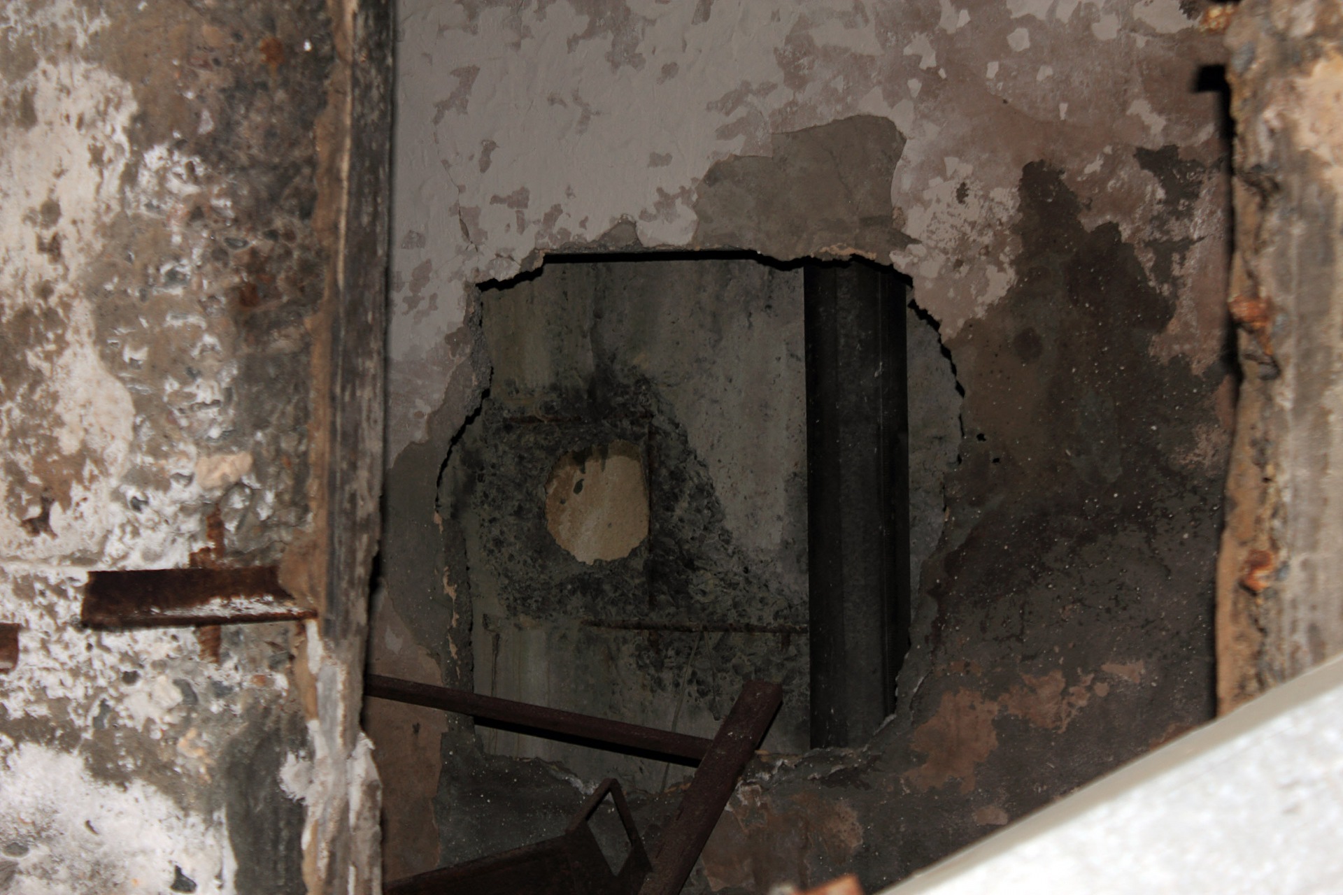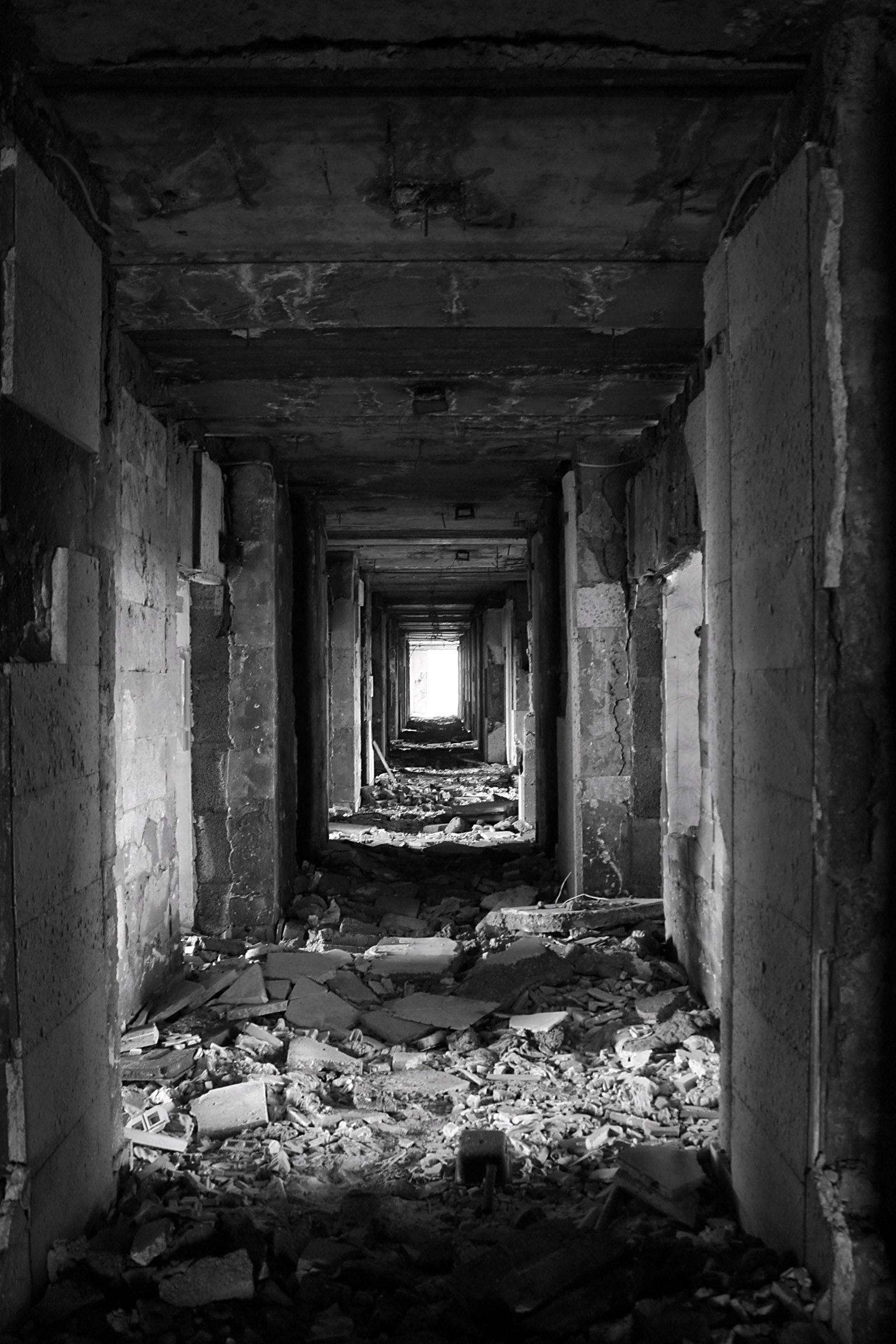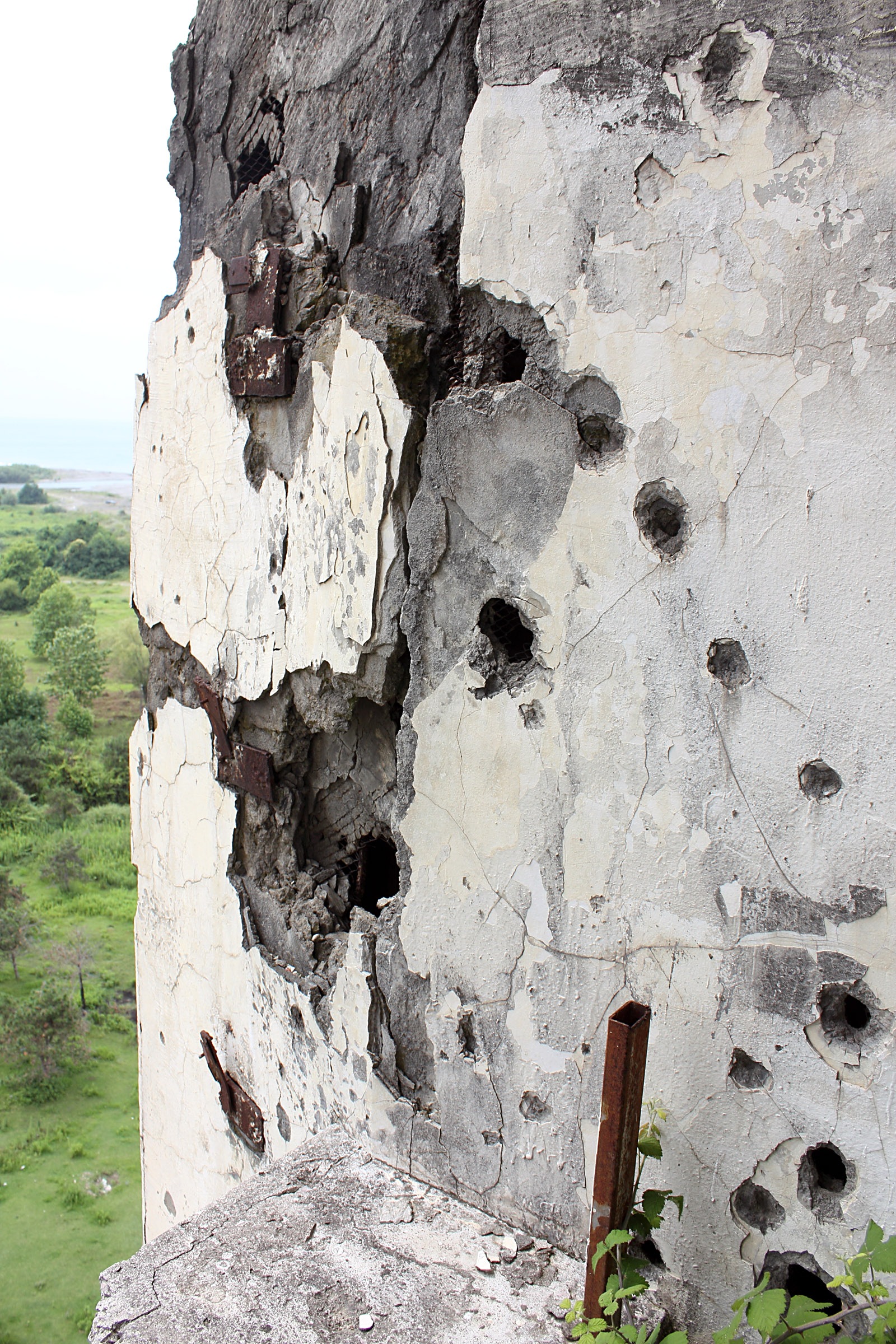 Только подойдя ближе, видишь, что это не просто брошенное здание. Оно хорошо обстреляно… Вокруг валяется множество гильз, стены буквально испещрены следами от пуль. В районе 7-8 этажа из-за плотности обстрела снесло даже перила балкона… На тех же этажах – огромные дыры в стенах от крупнокалиберного снаряда…