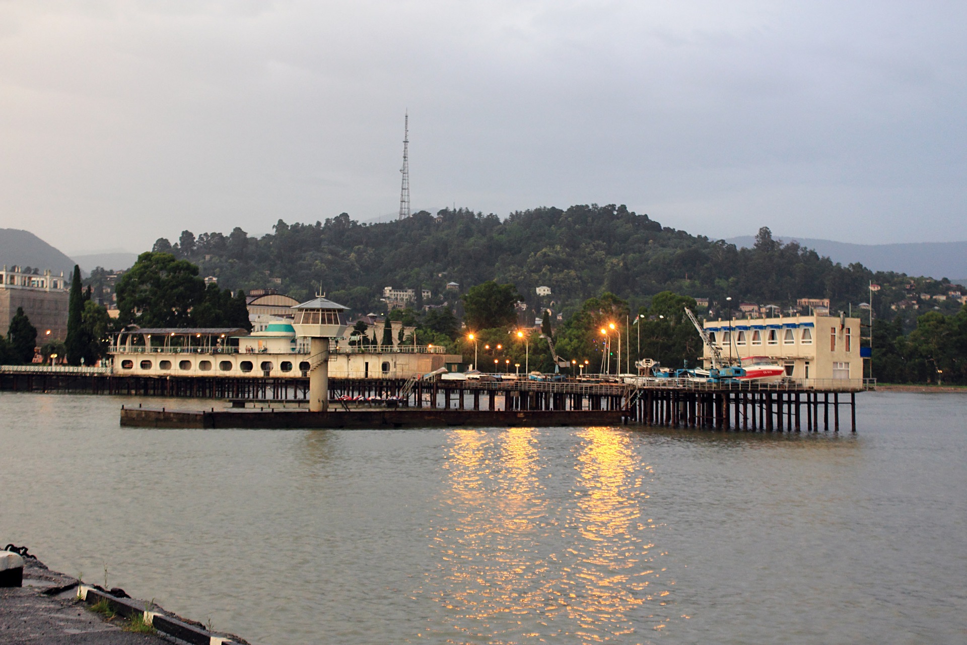 Пока суть да дело – а дело было в субботу – пошел дождь. Не очень сильный. Странно, но я напрочь забыла, что в этих краях летом тоже случаются дожди. Сидеть в палатке было уныло, прогулялись по набережной в Сухуме. Народ весь смыло дождиком, кое-кто отсиживался в кафешках, с причала рыбачил местный мужичонка, а поодаль плескались дельфины. Жаль, далековато было снимать, да и вокруг всё было серым и унылым из-за пасмурной погоды… На набережную мы и в хорошую погоду приезжали прогуляться – но она меня совершенно не вдохновила.