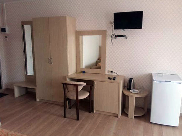 Номера с частичными удобствами, санузел расположен на этаже, телевизор и холодильник в холле. В номере имеется индивидуальная раковина с зеркалом. Номера оборудованы балконом с видом на парк или море.