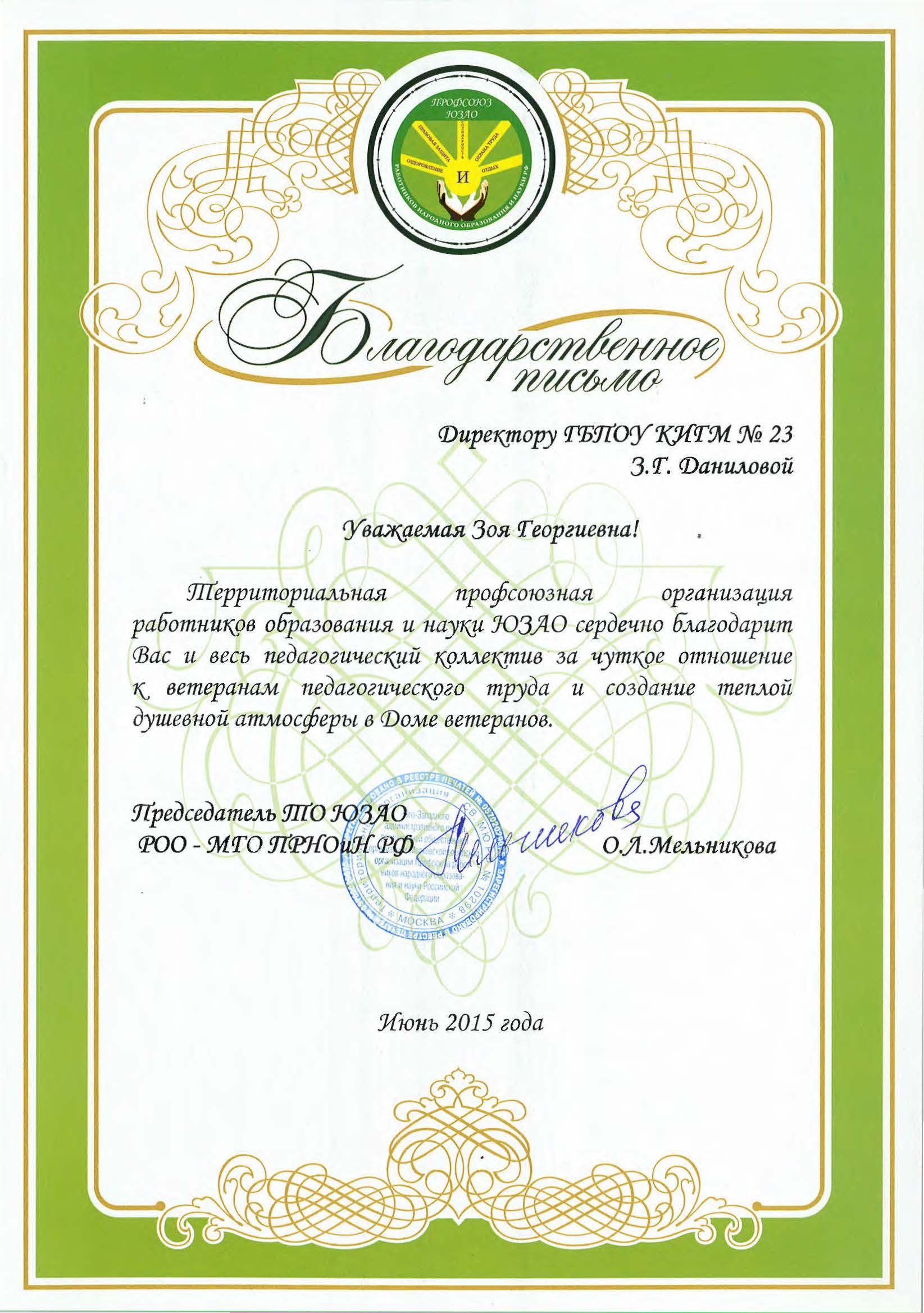 Огромное спасибо департаменту образования, городскому совету ВПТ, московскому колледжу № 23, профсоюзной организации за создание Дома Ветеранов, где могут отдохнуть педагоги, отдавшие много лет школе и ушедшие на заслуженный отдых.