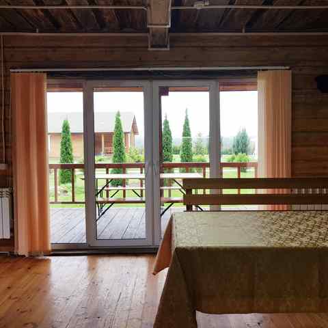 К услугам отдыхающих комфортабельный деревянные дом со всем необходимым для беззаботного отдыха. Вместимость трехкомнатного домика до 10 человек, а его сердце – гостиная с русской печью, в которой приятно провести время с семьей и друзьями. Просторная кухня оборудована всей необходимой бытовой техникой для приготовления пищи: холодильник, микроволновая печь, плита, электрический чайник и посуда. Также готовить можно и в русской печи. Если вы хотите полностью отдохнуть от повседневных забот, то персонал базы отдыха приготовит для вас еду и накроет на стол. Повара угостят традиционными белорусскими блюдами и деликатесами из свежей рыбы и дичи.