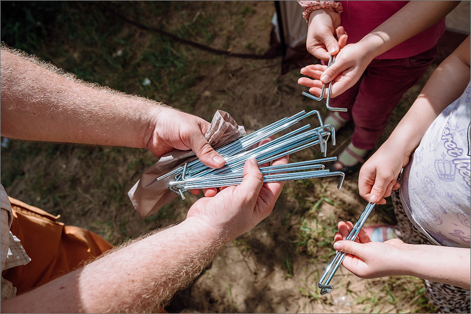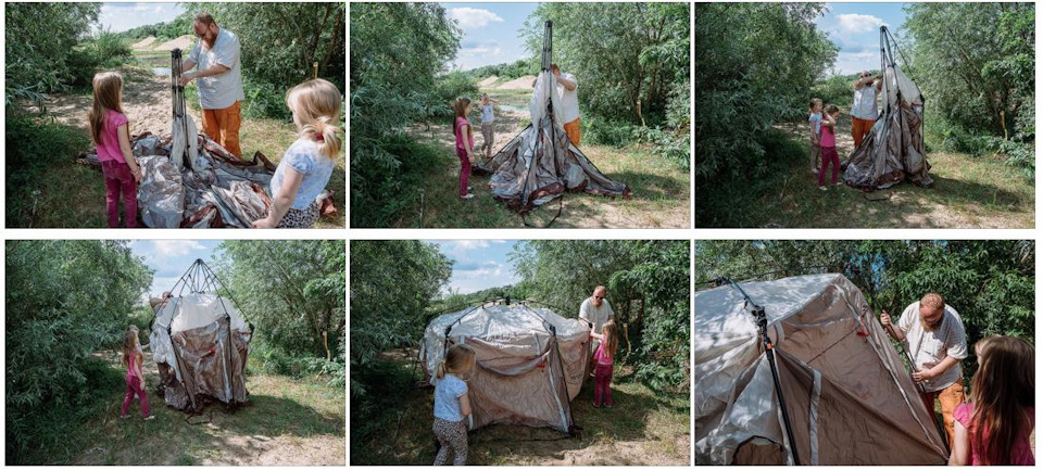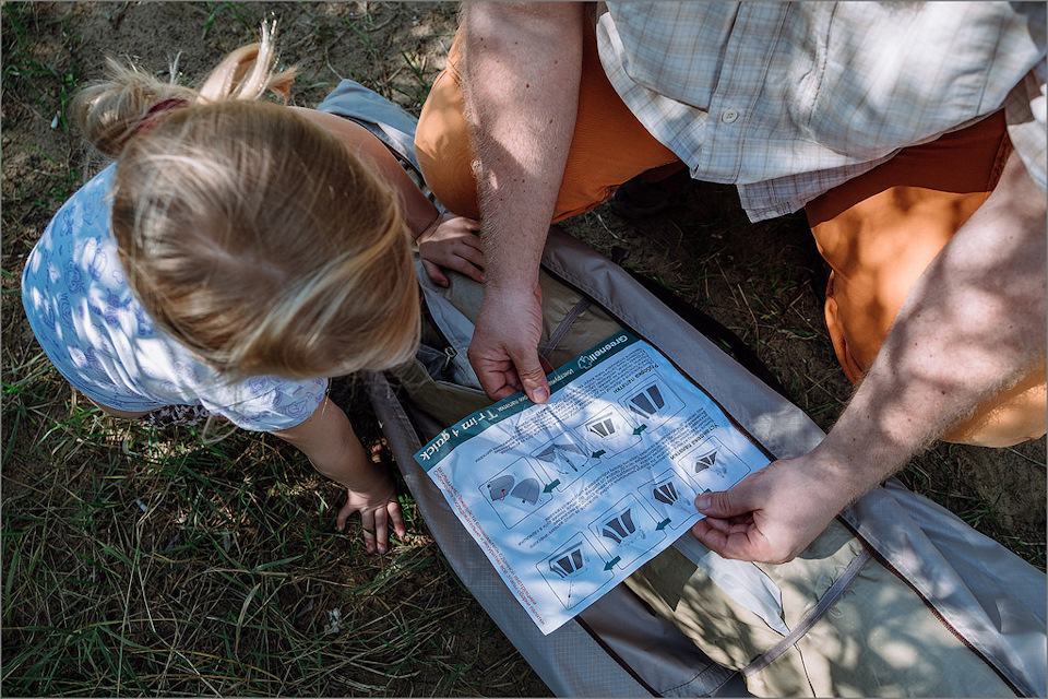 Сначала все раскладывается по принципу зонтика, а потом просто дуги выдвигаются на полную высоту. И все. Осталось пройти по периметру и закрепить палатку колышками. Мне кажется, что в следующий раз ее вполне самостоятельно смогут разложить дети :)