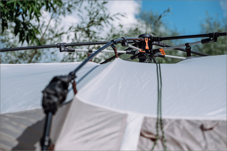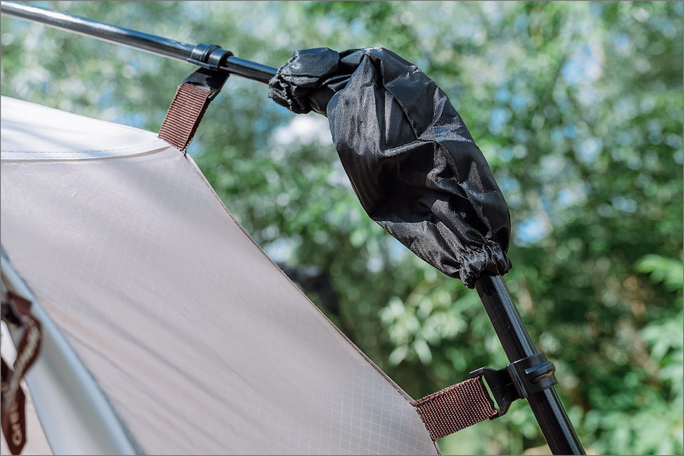 Собирается все тоже за пару минут — чтобы сложить палатку надо просто потянуть за "хвостик" и с помощью кнопок сложить дуги. После этого все элементарно запаковавается в чехол