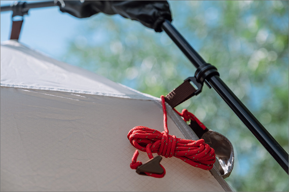 Классные веревочки-растяжки. Но нам они даже толком не понадобились — сильного ветра не было, палатка стояла среди кустов, поэтому решили не ставить растяжки.