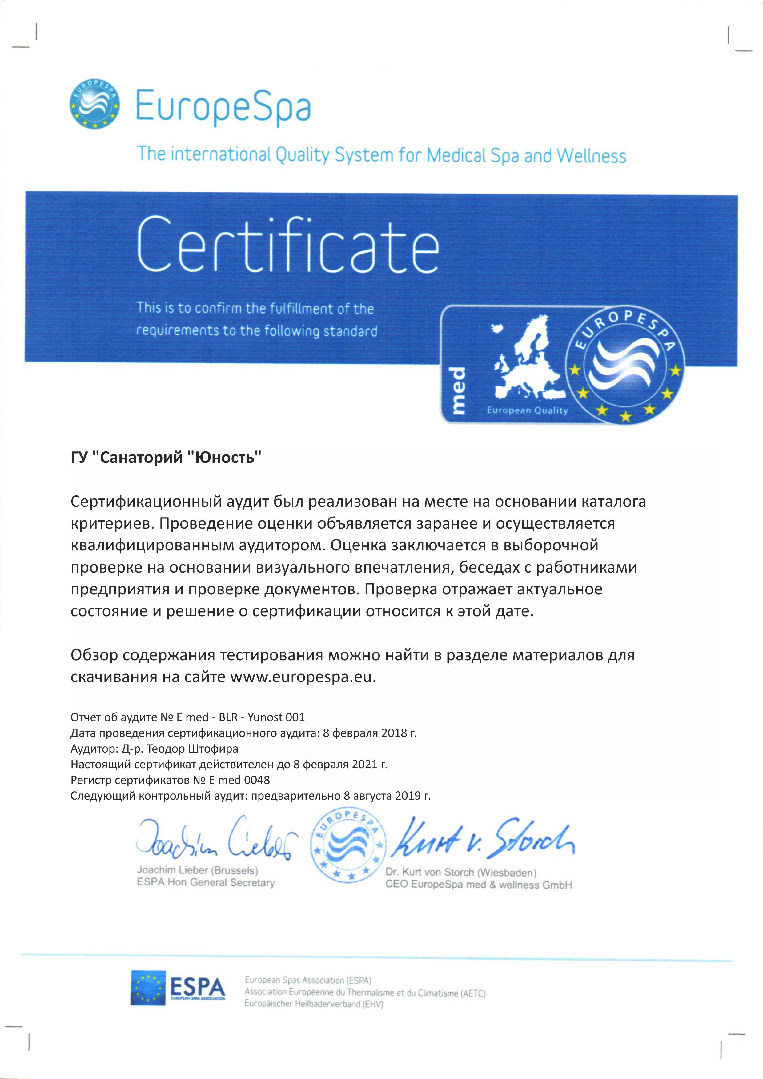 С 30.09 по 2.10 в санатории "Юность" был проведен аудит доктором Теодором Штофира из Европейской ассоциации курортов (ESPA). Согласно заключению эксперта, медицинский СПА-курорт "Юность" соответствует всем критериям сертификата европейского качества "EuropeSpa Med".