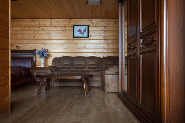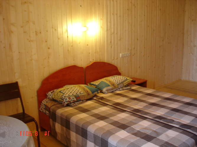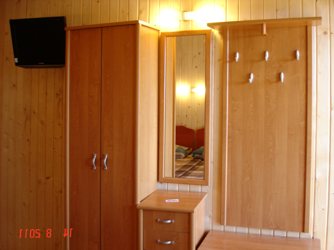 В номере 2 кровати, кресло-кровать, прикроватная тумбочка, журнальный стол, 2 стула, шкаф для одежды, вешалка, зеркало, тумба для обуви, бра, телевизор с пультом дистанционного управления (29 программ), холодильник, кондиционер. Стены деревянные, прикроватные коврики, на окнах портьеры. Санузел с принудительной вытяжной системой, душем, унитазом и умывальником, фен.